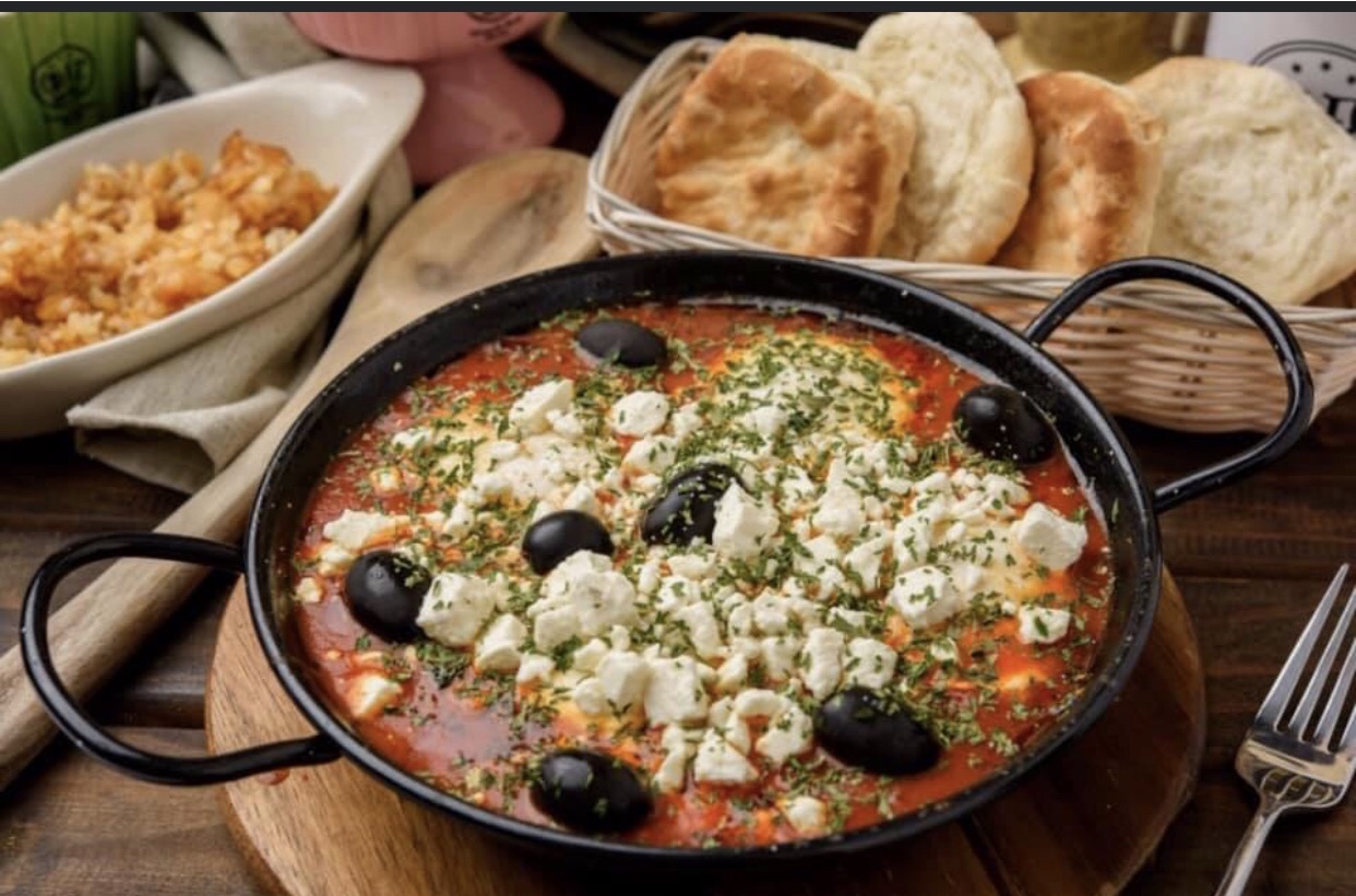 Three eggs poached in housemade tomato sauce with onions, jalapeños, bell peppers, garlic, feta cheese, black olives & parsley, served with two biscuits & crispy potatoes